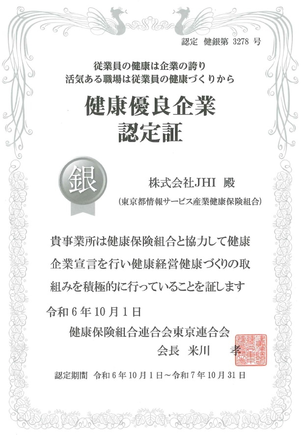 お知らせ 会社情報 2024.10.22 健康優良企業「銀の認定」を取得いたしました 株式会社JHI (以下、JHI) は、職場の健康づくりや環境整備などの積極的な健康経営の取り組みを評価いただき、2024年10月1日より健康保険組合連合会東京連合会発行の健康優良企業「銀の認定」を受けましたことをご報告いたします。 JHIは従業員の健康を考え、さまざまな健康支援プログラムや福利厚生を導入してまいりました。これにより、従業員一人一人の健康意識が高まり、生産性の向上や職場の活気が増したと考えております。 今後も健康経営を推進し、従業員が安心して働ける環境づくりに努めてまいります。 お知らせ一覧に戻る お知らせ一覧に戻る